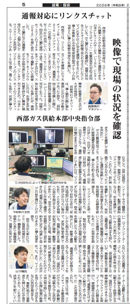 このたび、2026年2月9日発行の業界専門紙「ガスエネルギー新聞」において、当社が提供するビデオ通話サービス「LINX Chat(リンクスチャット)」を活用した西部ガス株式会社様の導入事例が掲載されました。